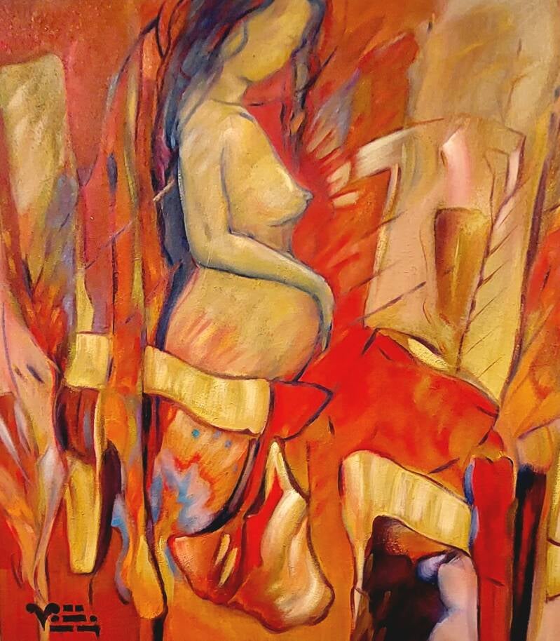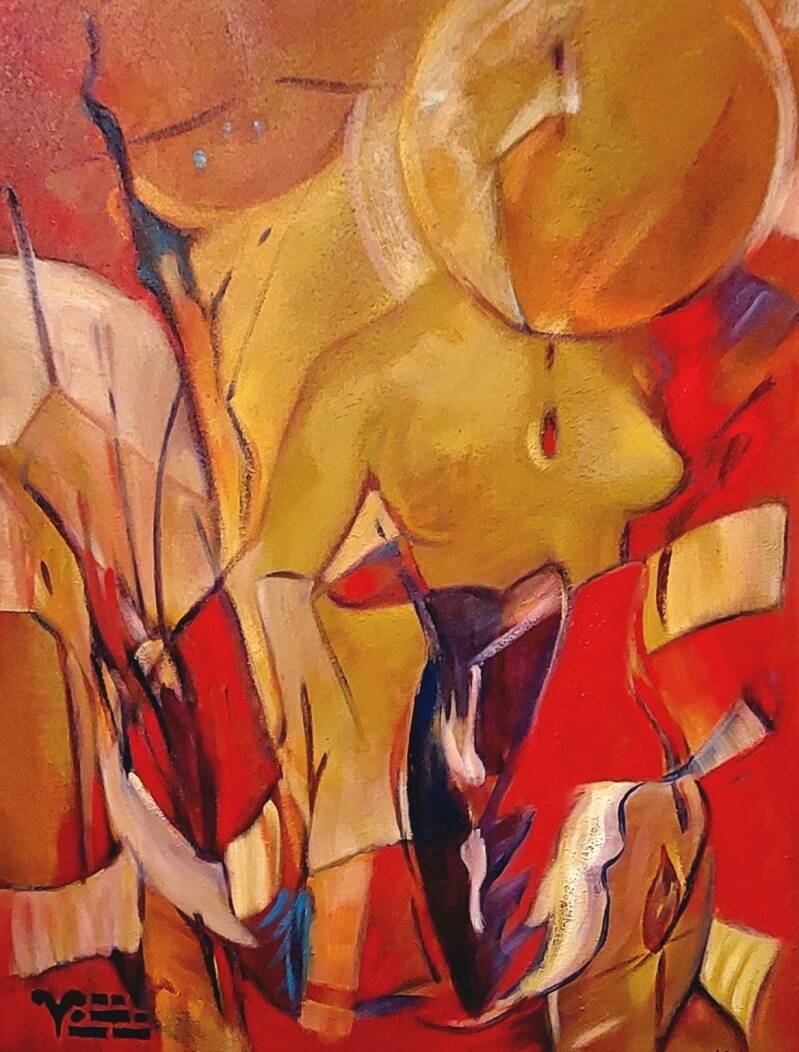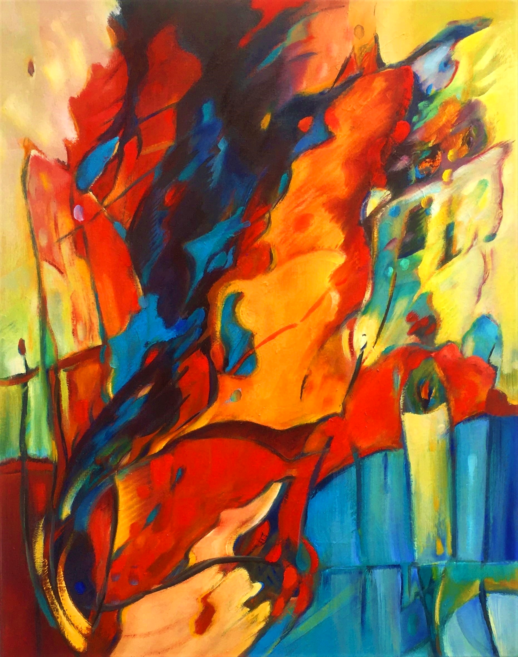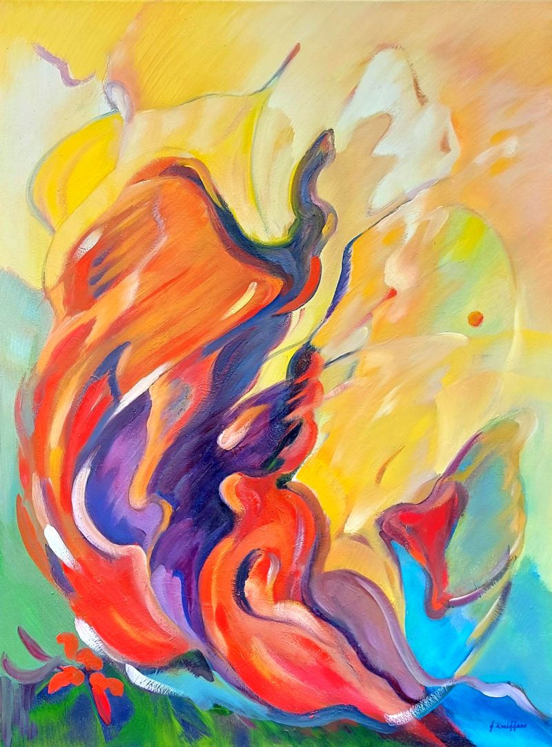 Een dans van kleur en beweging ontvouwt zich als een innerlijke vlam: warm, speels en krachtig, waar fantasie vrij door het doek stroomt en licht zijn eigen weg zoekt.