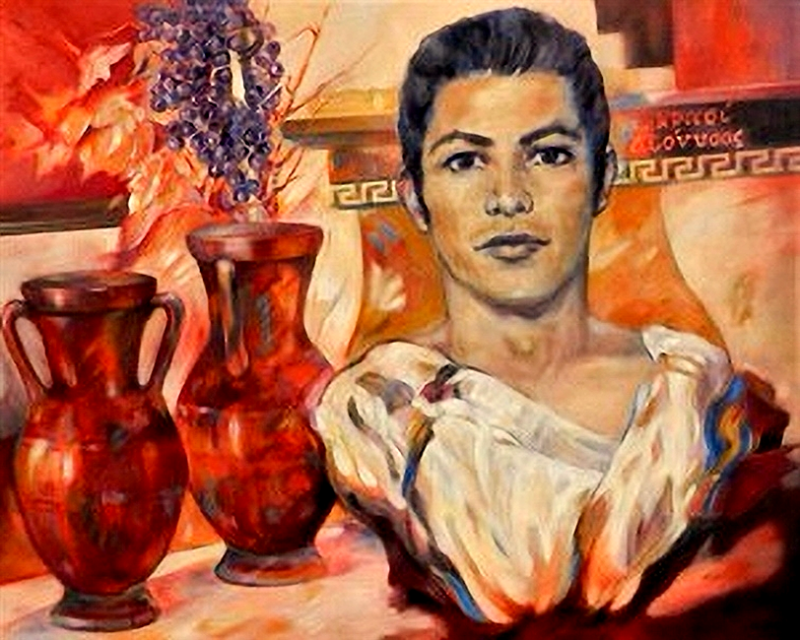 In dit academisch werk verschijnt Dionysos als een jonge, serene wijngod. Zijn rustige blik contrasteert met de warme, rijke kleuren rondom hem: amforen, druiven en klassieke motieven die verwijzen naar overvloed, ritueel, en de mediterrane cultuur in een tijdloze harmonie — een ontmoeting tussen mythologie en menselijke kwetsbaarheid.