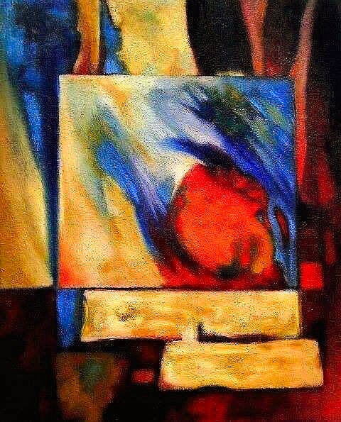 In vurige tinten van rood, oker en karmijn ontvouwt zich een gestileerde vrouwelijke figuur, badend in de energie van Pachamama. Haar ronde hoofd en zichtbare borst symboliseren vruchtbaarheid en verbondenheid met de aarde. De dynamische penseelstreken en contrasterende vlakken — blauw, zwart, goud — roepen de Andes op, met hun ritmes van wind, vuur en steen. Het geheel ademt een spirituele gloed, als een visioen van Moeder Aarde in trance, tussen abstractie en oerbeeld.