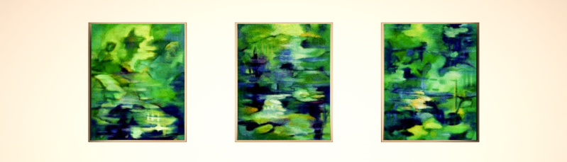 Abstract drieluik in olieverf, geïnspireerd door de bomen en vijverreflecties van het Solhofpark. Lagen van groen, blauw en licht vloeien in elkaar over en roepen de stille beweging en rust van het park op.