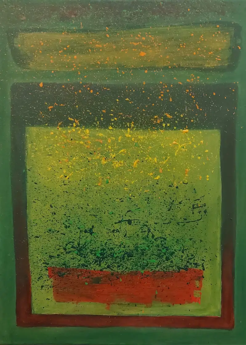 Een ritmisch en zonnig drieluik waarin de akker zich uitstrekt onder een heldere hemel. De kleuren bruisen van leven: geel, groen en blauw vloeien samen in een dans van licht. De bomen aan de horizon wiegen mee in de zomerse bries, hun kruinen golven als ritmische echo van de akkerlijnen. De penseelstreken laten het landschap vibreren van energie en beweging.