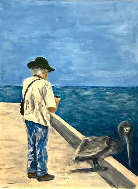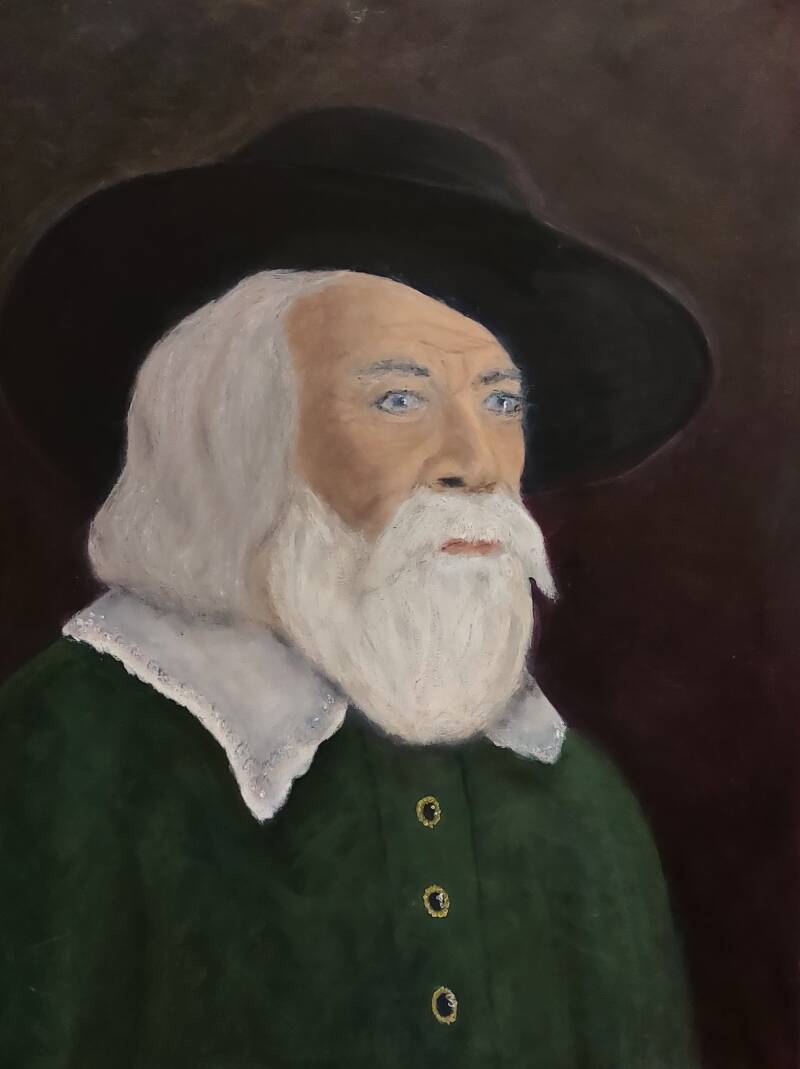 Een verstilde blik onder een schaduwrijke hoed. Witte haren en baard vangen het licht, als echo van een barokke meester. De groene mantel met gouden knopen verbindt heden en verleden in één gebaar.